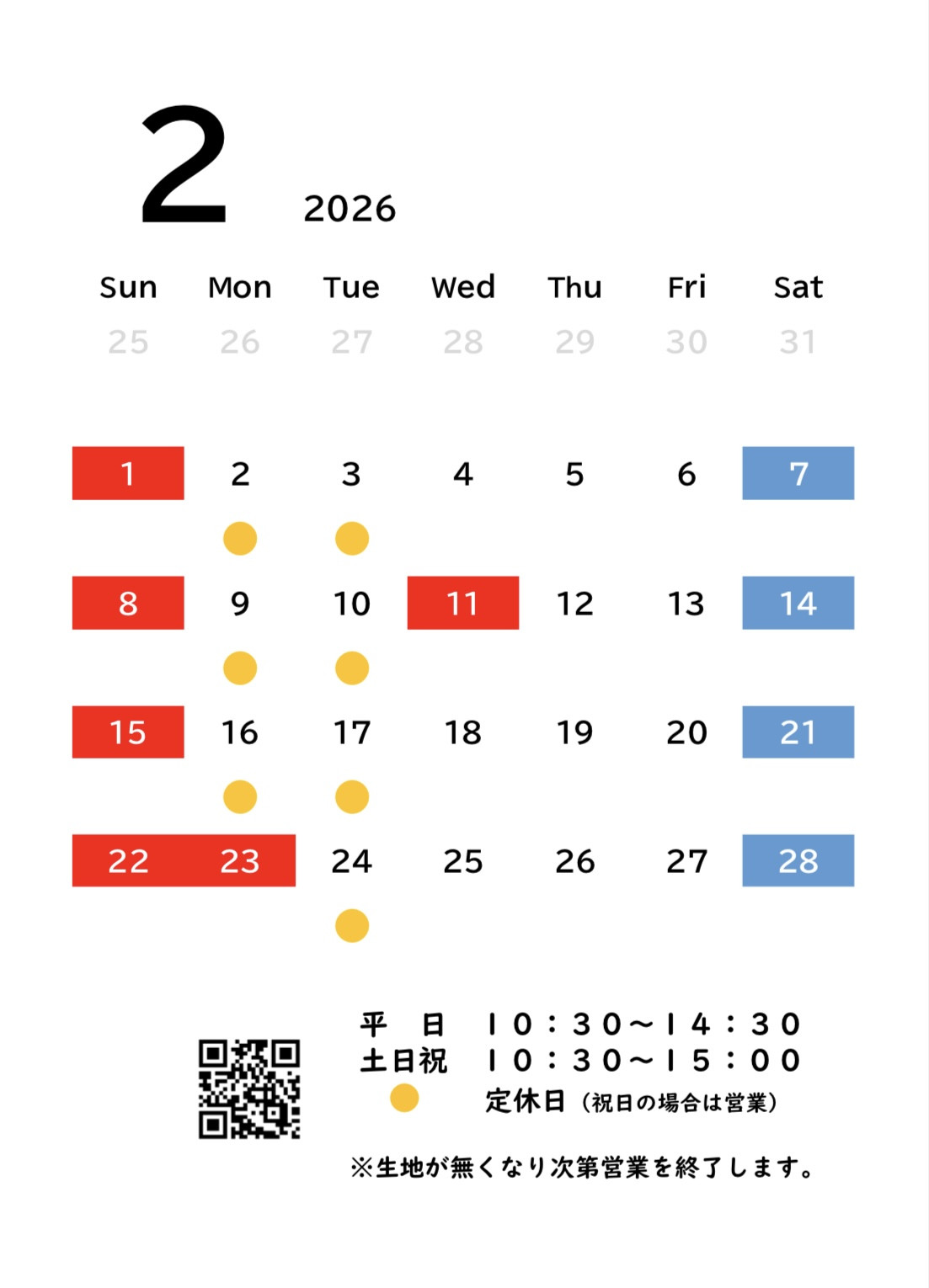 2月の営業カレンダー