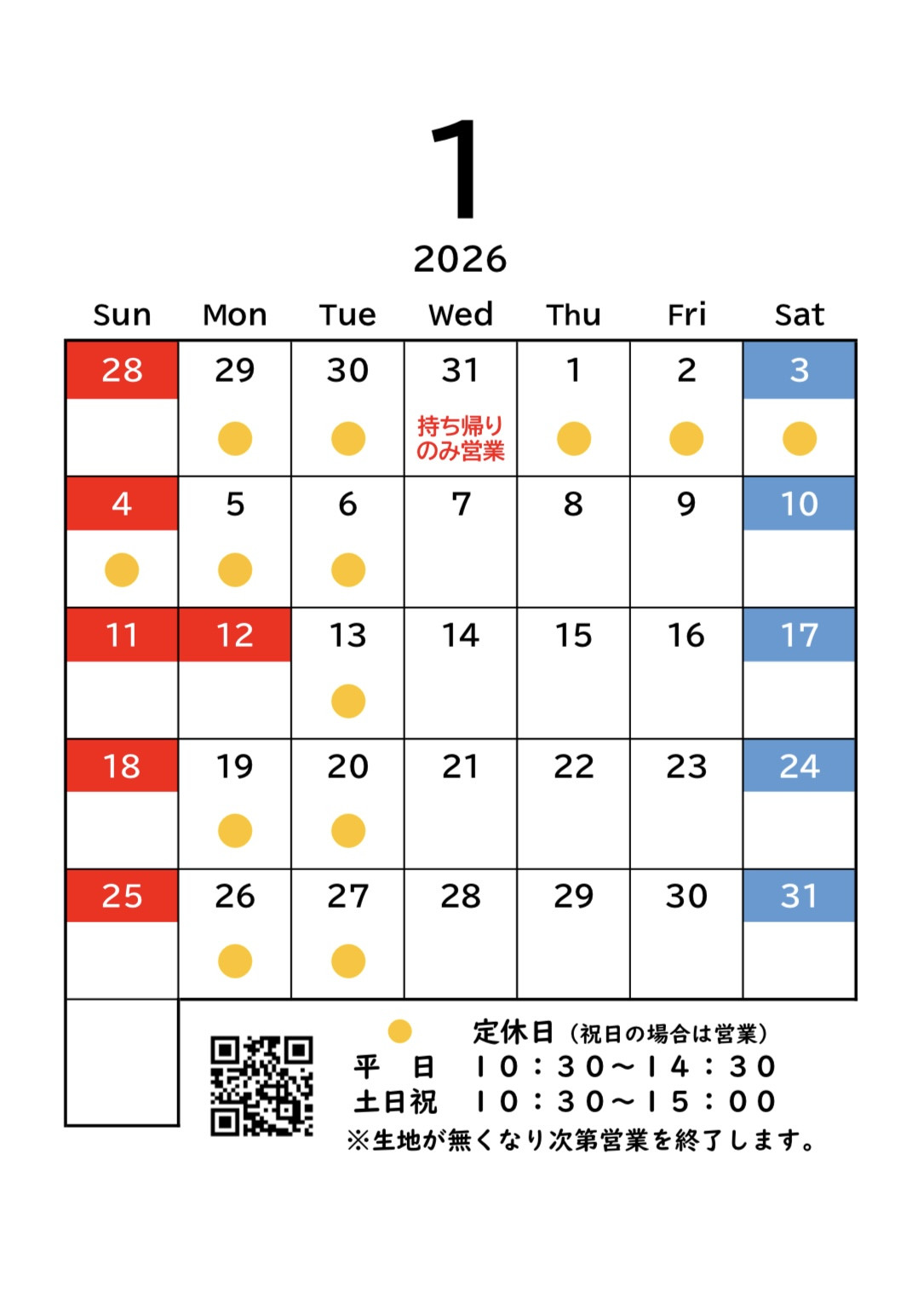 1月の営業カレンダー
