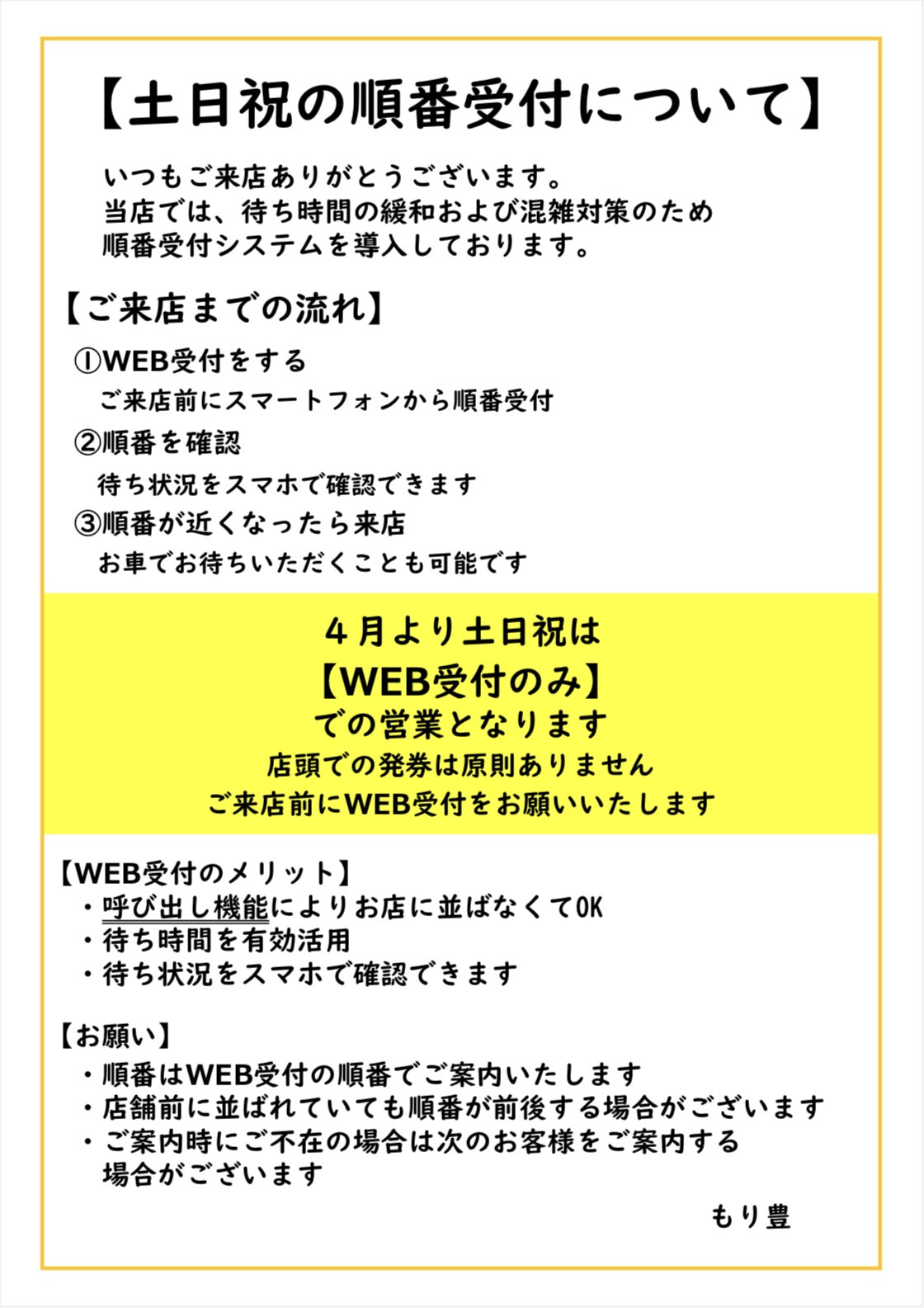 土日祝の受付方法を「WEB順番受付のみ」へ変更させていただきます。
